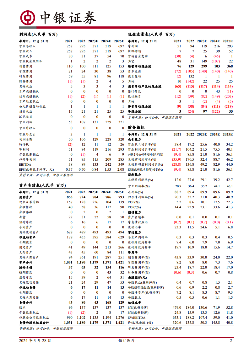 佰仁医疗在2023年展现了稳健的整体业绩增长和强劲的第四季度表现,其三大核心业务板块均实现显著增长。公司在创新研发方面的持续投入和多款核心产品进入临床试验及注册审批阶段,预示着未来业绩增长的强大驱动力。尽管短期内研发投入和股权支付费用对盈利预测造成一定影响,但公司领先的研发平台和丰富的产品管线为其长期发展奠定了坚实基础。综合来看,佰仁医疗具备持续高速增长的潜力,维持“买入”评级。