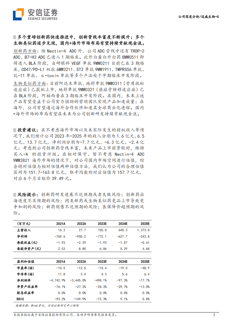 - 产品峰值PS倍数估值法: 考虑到Nectin-4 ADC 9MW2821成药确定性高、创新程度高、竞争格局好,给予4倍PS倍数;其他产品给予2倍PS倍数。测算得公司价值为151.7亿元。