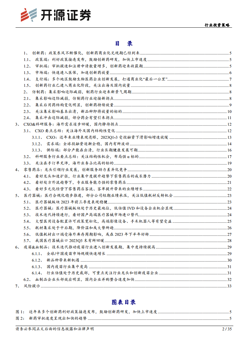 科研服务:结构性机会与强α标的 科研服务行业的需求端与CXO基本一致,海外增长情况依然健康(部分公司同比增速约40%),国内需求尚未看到拐点,但科研端需求相对刚性,增长情况较好。供给端在快速扩充后也正逐步出清,以皓元医药、诺唯赞为代表的公司正在优化人员。从经营节奏看,2H23科研服务公司的人效有望逐步提升,利润弹性逐步释放。报告强调,科研服务公司多为细分赛道的优质公司,国产替代、政策鼓励及拓展海外市场是其清晰的成长路径。建议关注在手订单充沛、海外业务占比高的标的,如药明康德、诺思格、普蕊斯、泓博医药、阳光诺和(CXO),以及奥浦迈、毕得医药、百普赛斯、皓元医药、昊帆生物(科研服务)。