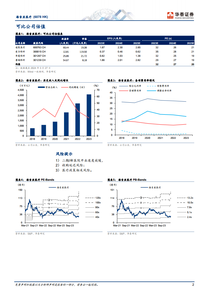 在估值方面,华泰研究给予海吉亚医疗2024年27倍的市盈率(PE),这一估值水平与A股可比公司的一致预测相符,体现了市场对医疗服务行业领先企业的合理定价。基于此估值,目标价设定为44.21港币。可比公司如通策医疗、爱尔眼科、华厦眼科和普瑞眼科在2024年的平均PE也为27倍,进一步支持了海吉亚医疗的估值合理性。