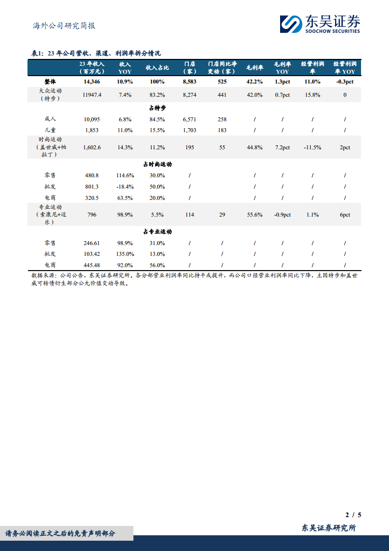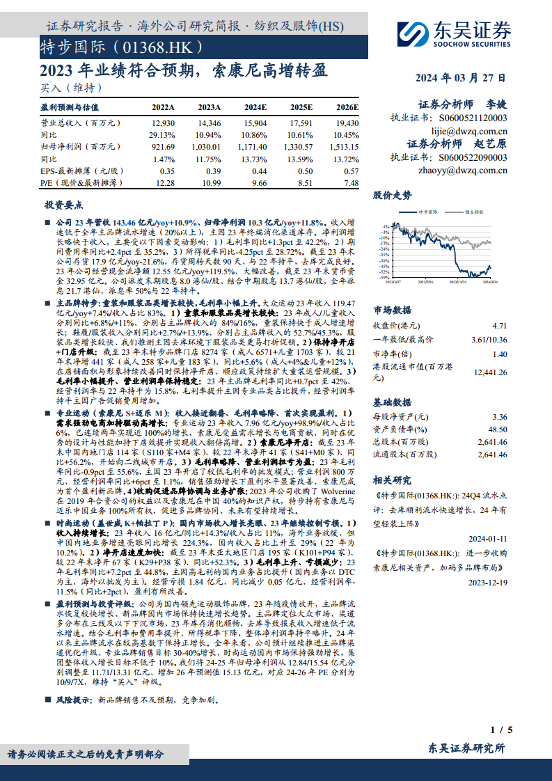 特步国际(01368):2023年业绩符合预期,索康尼高增转盈