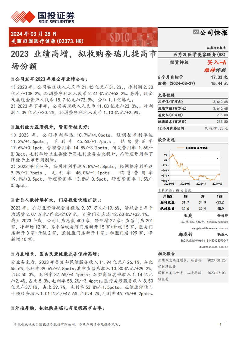 美丽田园医疗健康在2023年实现了卓越的财务表现,收入和净利润均实现高速增长,盈利能力显著提升。公司通过扩大活跃会员基础和门店网络,实现了稳健的内生增长,尤其在医疗美容和亚健康服务领域表现突出。同时,公司积极推进外延并购战略,拟收购奈瑞儿品牌,有望进一步巩固市场地位并实现品牌协同。尽管面临市场需求和新品牌发展等潜在风险,但鉴于其强劲的成长性和战略布局,国投证券维持“买入-A”评级,并对其未来发展持乐观态度。