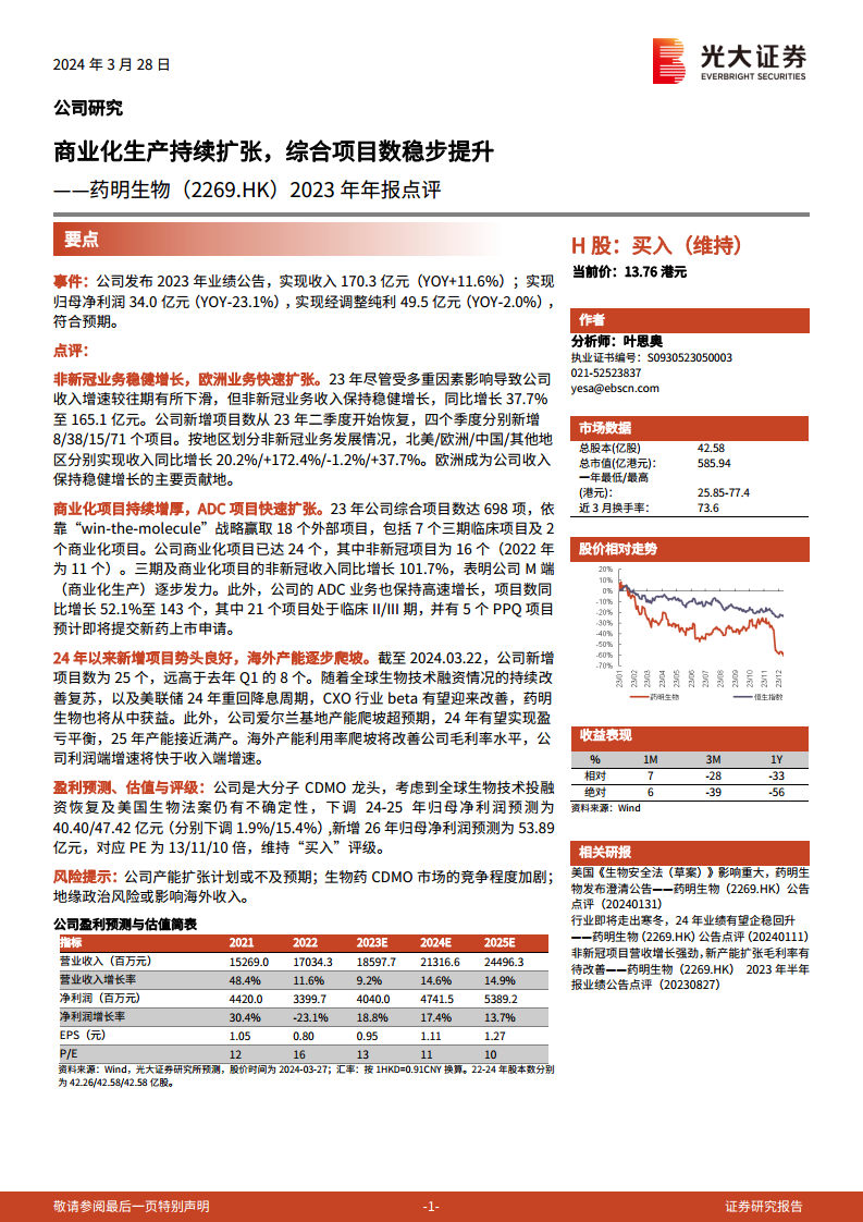 公司在2024年展现出良好的新增项目势头,截至3月22日新增项目数达25个,远超去年同期。爱尔兰基地产能爬坡超预期,预计2024年实现盈亏平衡,2025年接近满产,这将显著改善公司毛利率水平,推动利润增速快于收入增速。结合全球生物技术投融资环境的改善,公司未来增长潜力可期,维持“买入”评级。