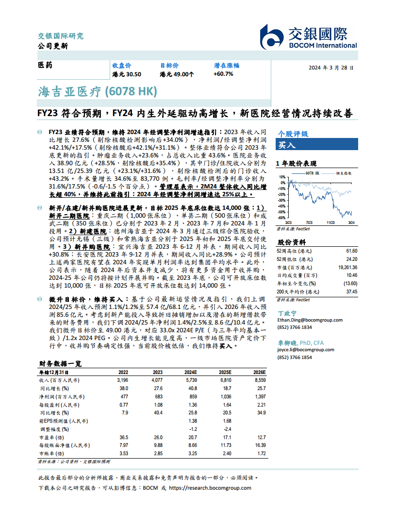 海吉亚医疗(06078):FY23符合预期,FY24内生外延驱动高增长,新医院经营情况持续改善