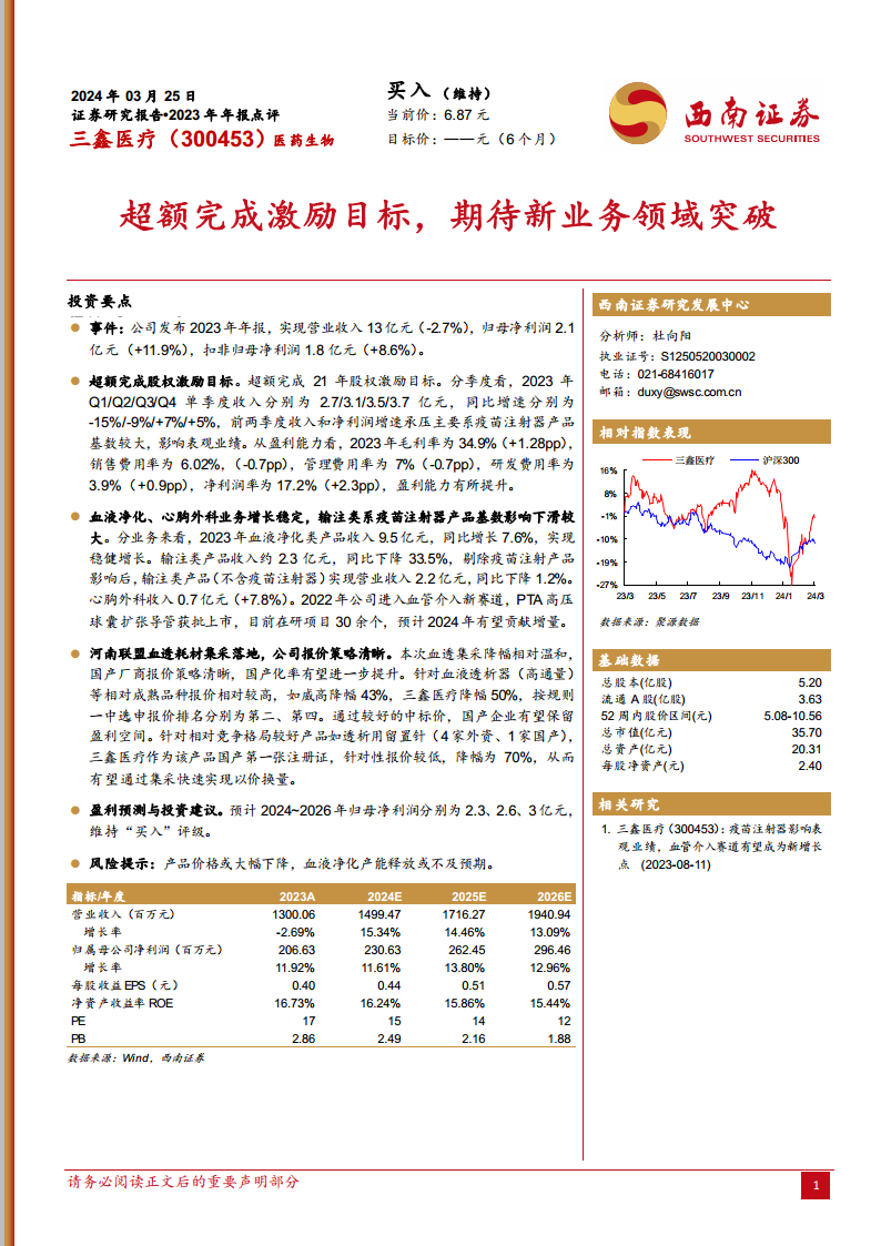 三鑫医疗在2023年展现了强劲的经营韧性和盈利能力,成功超额完成股权激励目标,并通过精细化管理实现了毛利率和净利润率的显著提升。尽管输注类业务受疫苗注射器高基数影响短期承压,但核心的血液净化业务保持稳健增长,并通过积极的集采策略巩固了市场地位。公司在心胸外科领域持续发力,并成功布局血管介入等创新赛道,PTA高压球囊扩张导管的获批上市预示着新的业绩增长点。综合来看,公司业务结构持续优化,新旧动能转换有序推进,未来业绩增长可期。基于对公司未来盈利能力的积极预测,西南证券维持“买入”评级,但投资者仍需关注产品价格波动和产能释放等潜在风险。