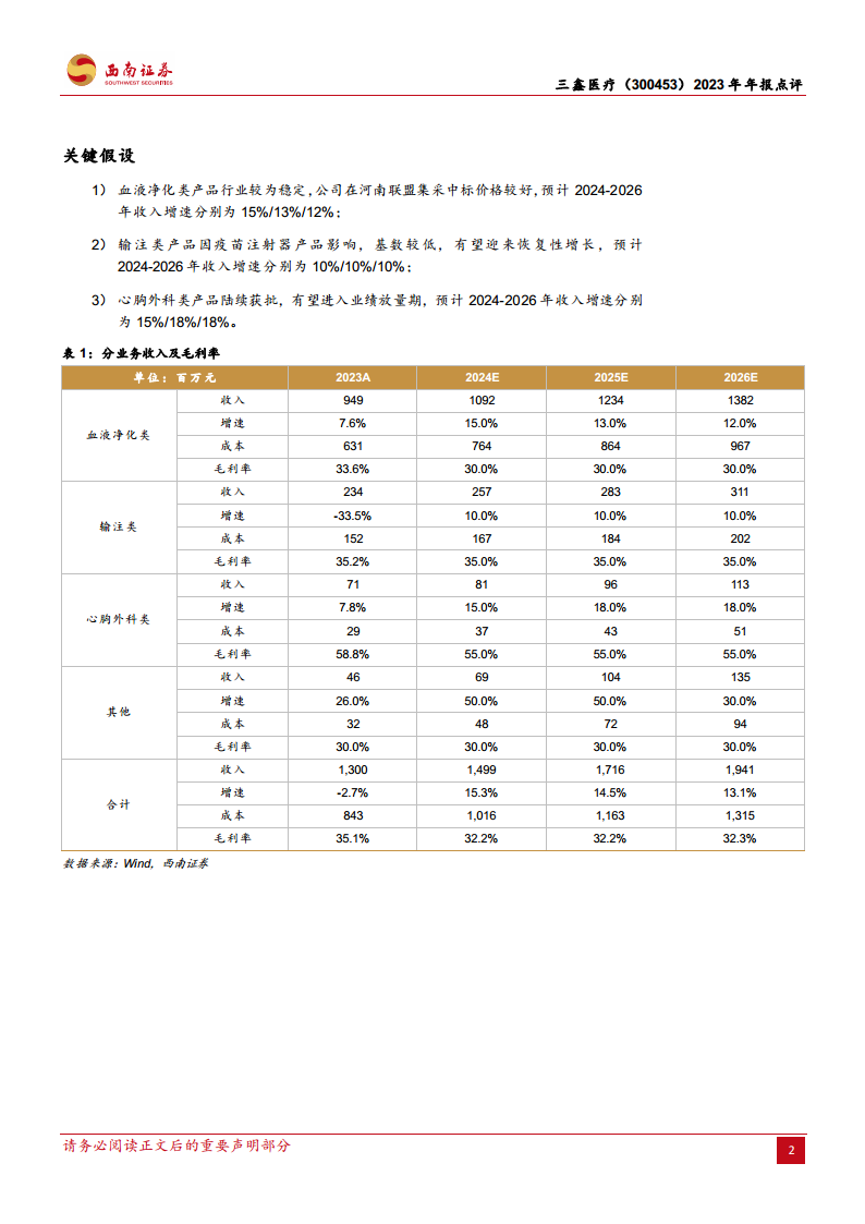 基于对各业务板块的增长预期和关键假设,西南证券预测三鑫医疗在未来几年将保持稳健的盈利增长。预计2024年至2026年,公司归母净利润将分别达到2.3亿元、2.6亿元和3亿元。