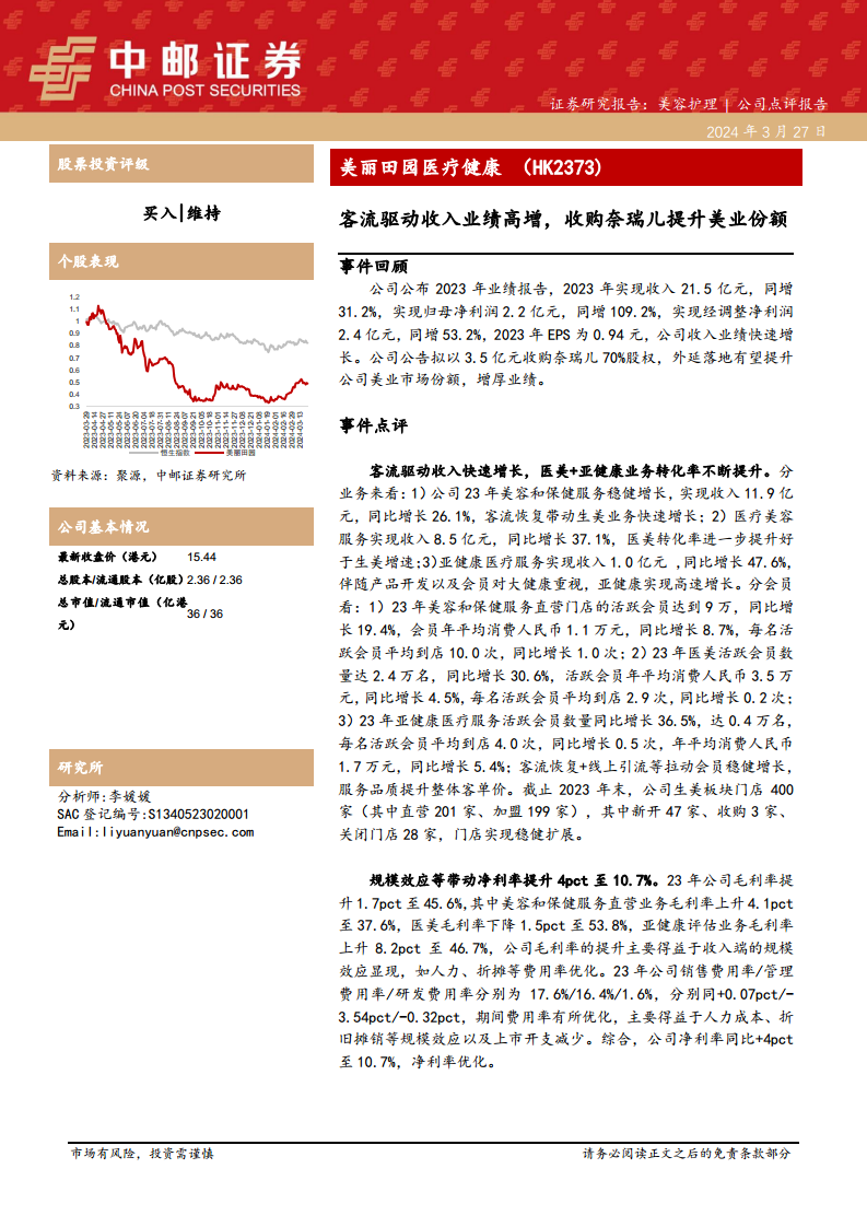 公司公告拟以3.5亿元人民币收购奈瑞儿70%的股权。奈瑞儿成立于2007年,是一家国内领先的智能美养品牌,旗下拥有80家美容及医疗保健服务门店、6家医疗美容服务门诊以及2家中医门店,主要分布在广州、深圳等大湾区核心城市。2023年,奈瑞儿实现收入5.14亿元,净利润33.4百万元。此次收购款项将分三期支付,并与奈瑞儿未来的净利润表现挂钩(24H1实现净利润0.2亿元,24年实现净利润0.5亿元)。此项外延式并购有望显著提升美丽田园在美业市场的份额,并进一步增厚公司业绩。