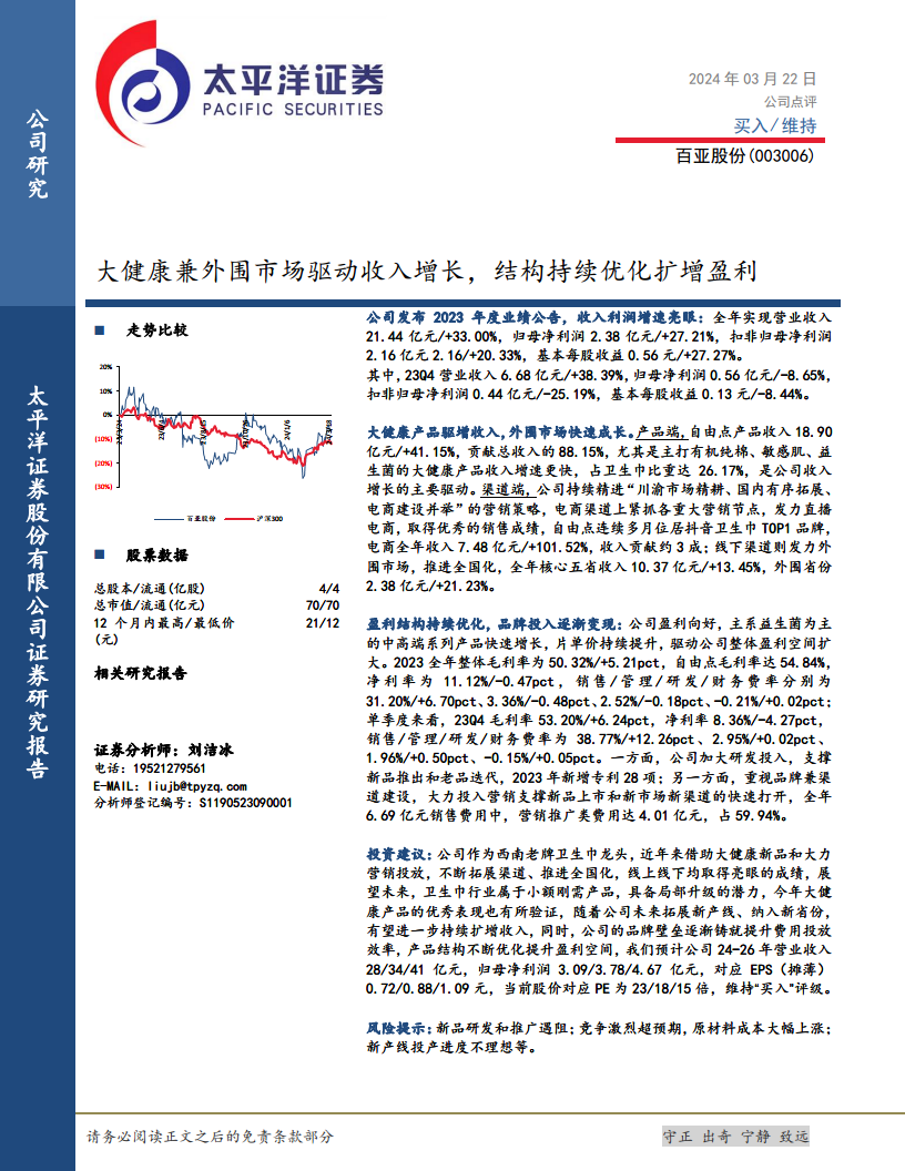 太平洋证券维持百亚股份“买入”评级。预计公司2024-2026年营业收入分别为28亿元、34亿元、41亿元;归母净利润分别为3.09亿元、3.78亿元、4.67亿元。对应摊薄每股收益分别为0.72元、0.88元、1.09元。当前股价对应PE分别为23倍、18倍、15倍。公司作为西南卫生巾龙头,未来有望通过拓展新产线、纳入新省份持续扩增收入,同时品牌壁垒提升费用投放效率,产品结构优化提升盈利空间。
