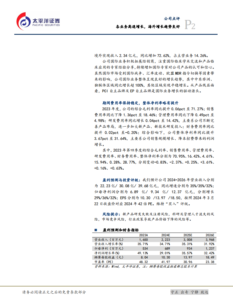 惠泰医疗在2023年展现出强劲的增长势头,营业收入和归母净利润均实现高速增长,经营性现金流大幅改善,显示出公司卓越的经营效率和盈利能力。公司在电生理、冠脉、外周介入等核心业务领域均取得显著进展,并通过持续的技术创新和产品布局不断巩固市场地位。尤其值得肯定的是,尽管面临复杂的国际环境,海外业务仍实现高速增长,成为公司未来发展的重要驱动力。期间费用率保持稳定,整体净利率有所提升,反映了公司在规模扩张的同时,有效控制了成本。基于对公司未来业绩的积极预测,太平洋证券维持“买入”评级,并设定了明确的目标价,表明对惠泰医疗长期增长潜力的信心。同时,报告也提示了新产品研发、人才流失、市场竞争和政策变化等潜在风险,建议投资者关注。