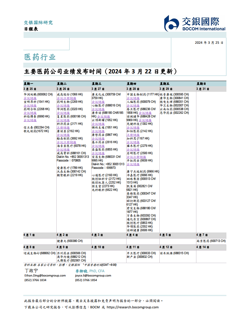 主要医药公司业绩发布时间(2024年3月22日更新)