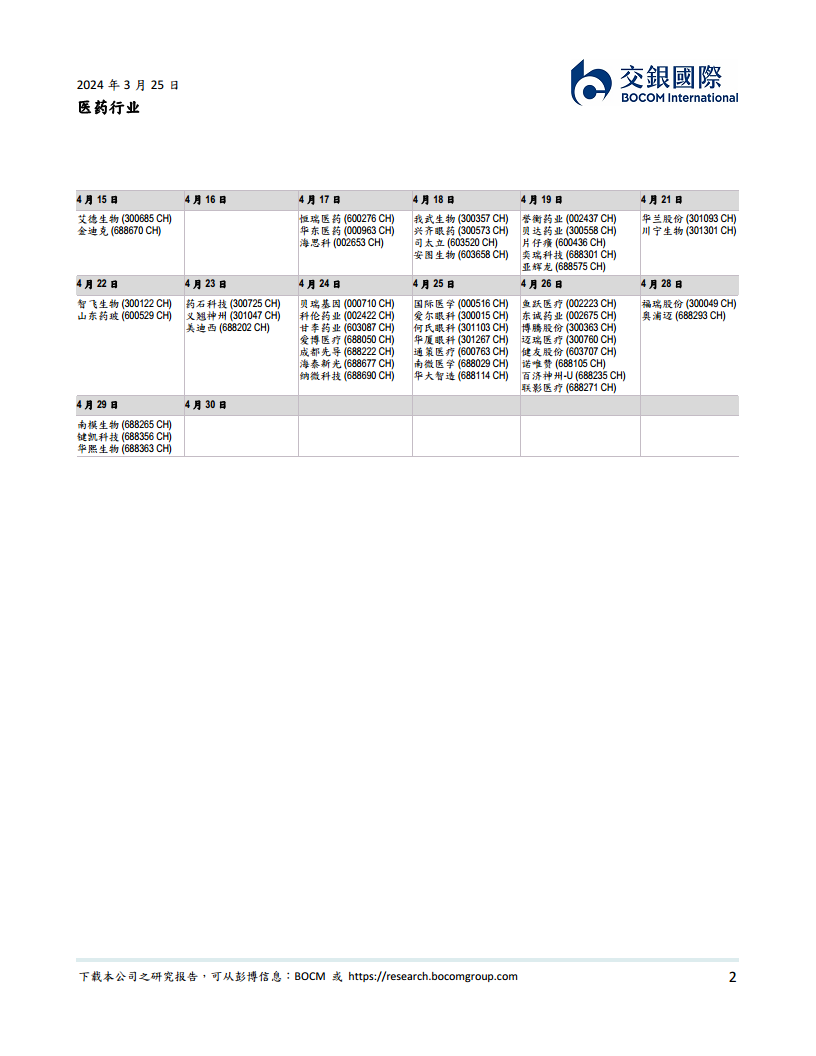 2024年3月下旬(3月25日至3月31日)是医药公司业绩发布的第一个高峰期,共有超过20家公司计划在此期间公布业绩。其中,3月28日和3月29日尤为密集,每日均有超过10家公司发布业绩。涵盖的公司类型广泛,包括生物制药(如中国生物制药、药明生物、康希诺)、医疗器械(如威高股份、心脉医疗、春立医疗)、CRO/CDMO(如康龙化成、药明合联)以及传统制药企业(如华润双鹤、人福医药、恩华药业)。香港上市和A股上市的公司均在此期间密集发布,显示出市场对该时段业绩表现的高度关注。