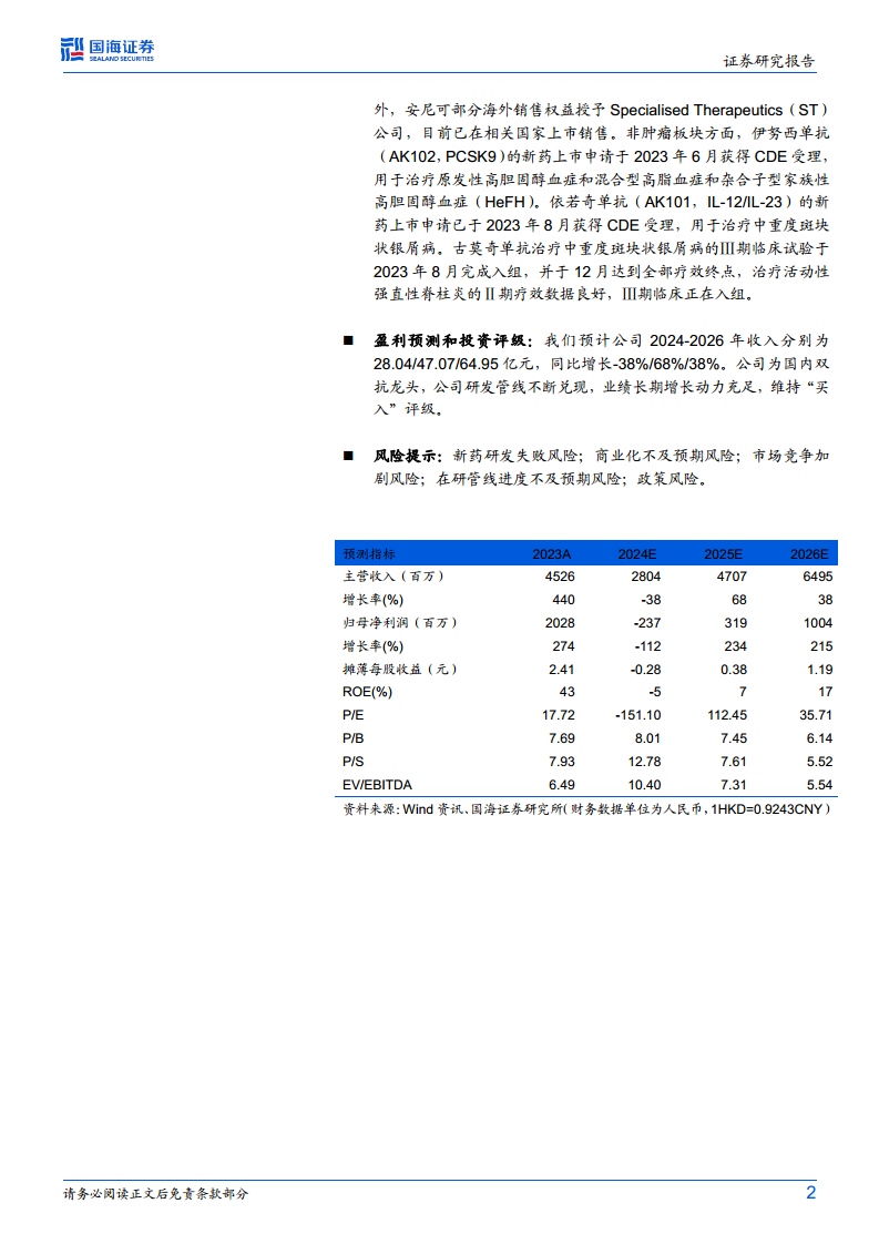 国海证券预计康方生物2024年至2026年的收入将分别达到28.04亿元、47.07亿元和64.95亿元,同比增长率分别为-38%、68%和38%。尽管2024年收入预计有所下降,可能与技术授权收入的波动性有关,但公司长期增长动力充足。鉴于康方生物作为国内双抗龙头企业的地位,其研发管线持续兑现,核心产品商业化能力强劲,以及未来多款重磅产品上市的预期,国海证券维持对其“买入”评级。