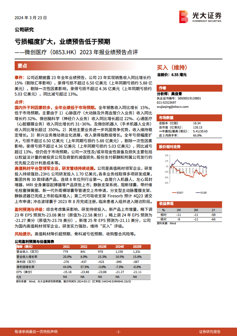 微创医疗2023年业绩预告显示,尽管销售收入同比增长约15%(剔除汇率影响),但全年亏损额扩大至不超过6.50亿美元,高于市场预期。剔除一次性因素影响后,亏损额虽同比减亏超过13%,但仍未达到市场预期。这主要受国内外不利因素、一次性及/或非现金性拨备及损失(如被投资公司及商誉减值、股份支付薪酬、优先股应计利息成本)影响。