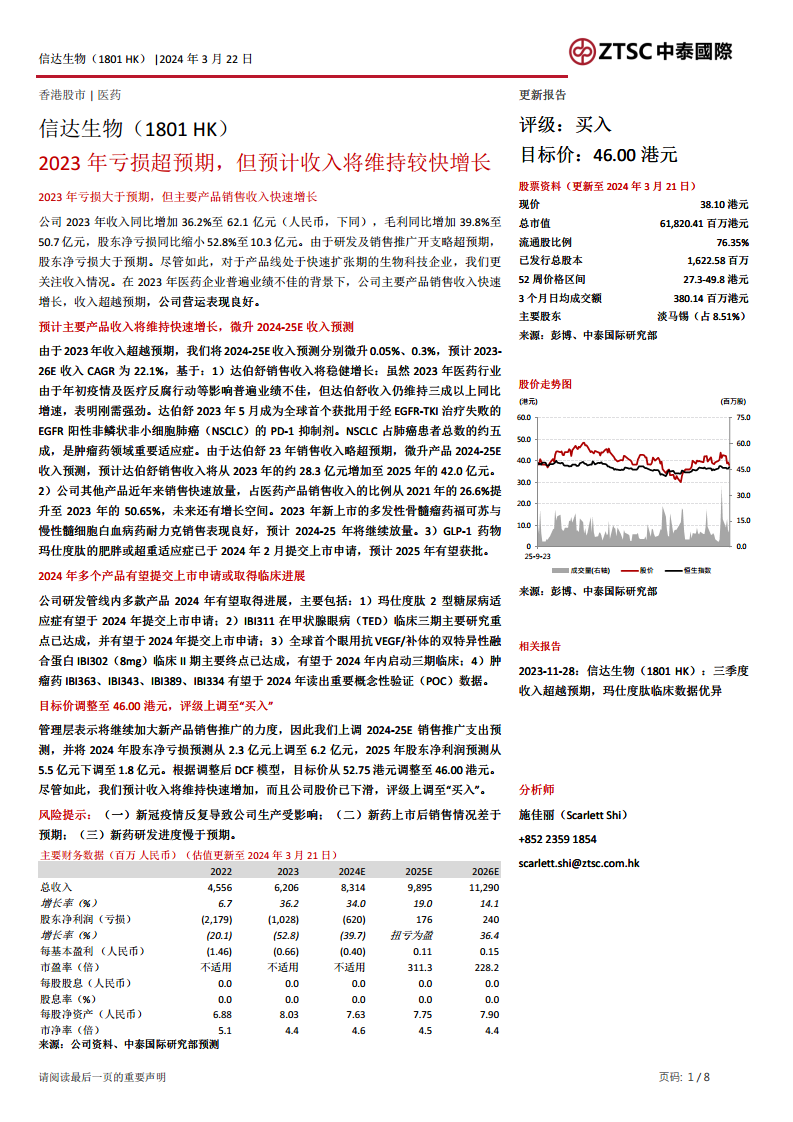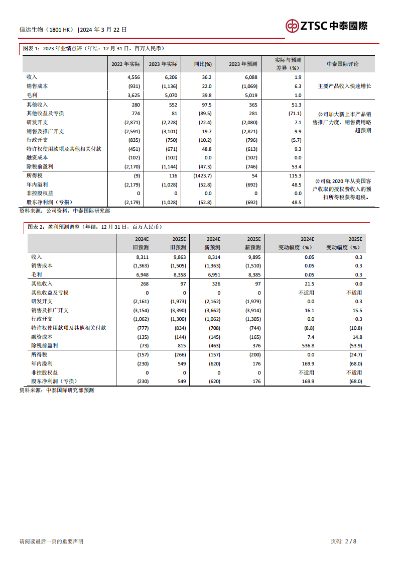 信达生物2023年实现收入62.1亿元人民币,同比增长36.2%,超出市场预期。毛利同比增长39.8%至50.7亿元。尽管股东净亏损同比缩小52.8%至10.3亿元,但由于研发及销售推广开支略超预期,导致亏损额高于此前预测。报告强调,在2023年医药企业普遍业绩不佳的环境下,公司主要产品销售收入的快速增长,体现了良好的营运表现和市场竞争力。