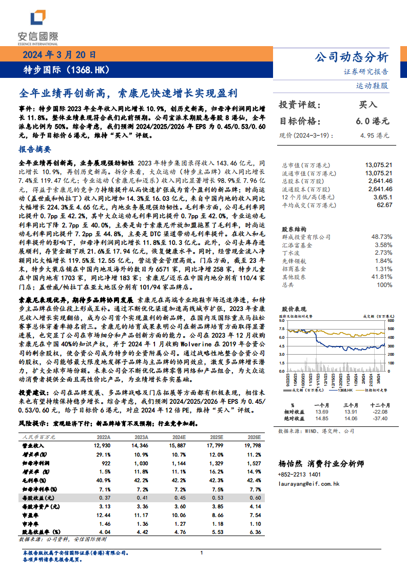 特步国际在2023年取得了卓越的业绩,收入和归母净利润均创历史新高,充分证明了其多品牌战略的成功和业务的强大韧性。特别是索康尼品牌的快速增长和盈利,成为公司新品牌培育的典范。公司通过高效的运营管理、持续的渠道拓展以及战略性的股权整合,进一步巩固了市场地位并增强了多品牌协同效应。鉴于其稳健的财务表现和清晰的增长策略,安信国际维持“买入”评级,并对特步国际未来的持续发展持乐观态度。