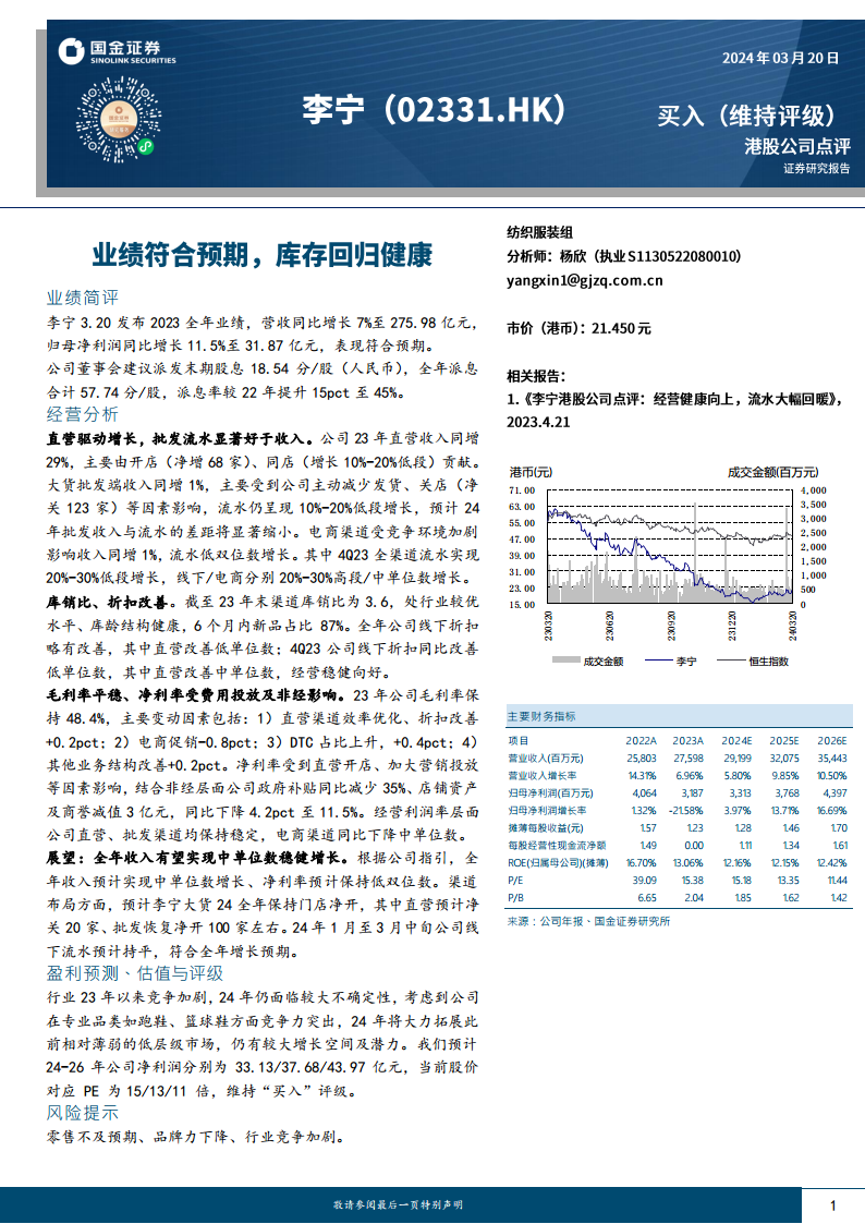李宁在2023年实现了营收的稳健增长,并通过直营渠道的扩张和批发渠道的精细化管理,有效提升了经营质量和渠道健康度。尽管净利润受到战略性投入和非经常性损益的影响有所下降,但公司在库存管理和折扣优化方面取得了积极进展。展望2024年,李宁预计将保持中单位数的收入增长,并计划通过强化专业品类优势和拓展低线市场,进一步释放其市场增长潜力。公司稳健的财务表现和提升的派息率,共同支撑了其“买入”的投资评级,但零售不及预期、品牌力下降及行业竞争加剧等风险仍需持续关注。