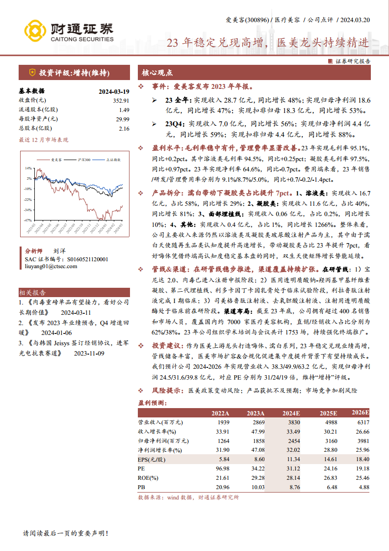 爱美客(300896):23年稳定兑现高增,医美龙头持续精进