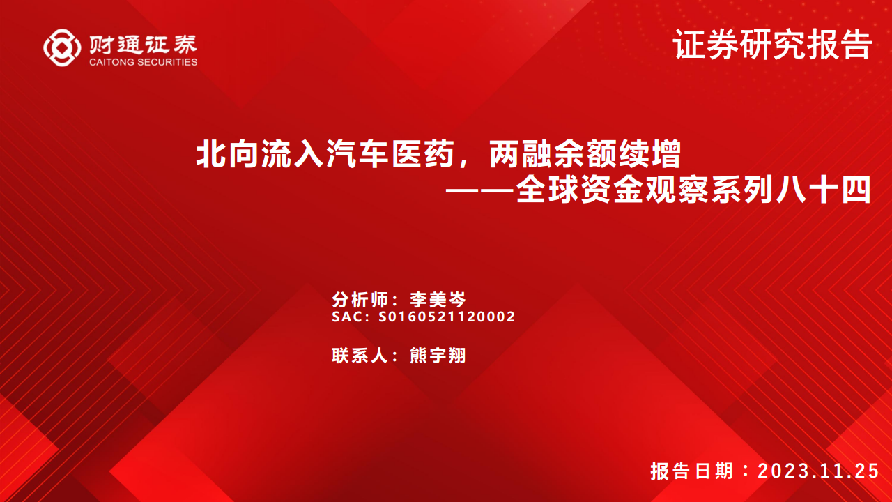 全球资金观察系列八十四:北向流入汽车医药,两融余额续增