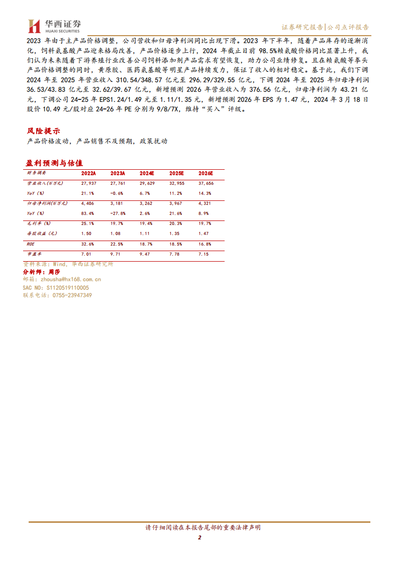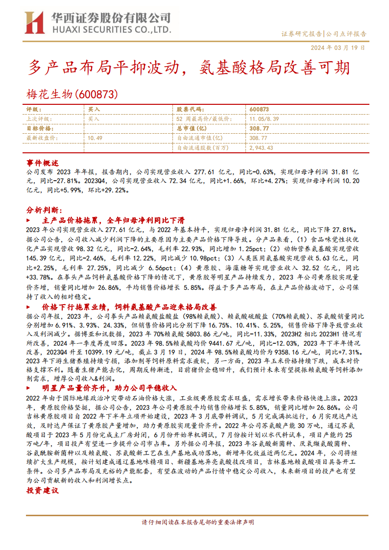 梅花生物在2023年面临主要产品价格下行的挑战,导致归母净利润同比下滑27.81%,但通过多产品布局策略,有效维持了营业收入的相对稳定。其中,饲料氨基酸产品虽受价格拖累,但销量保持增长,且市场格局已显现改善迹象,预计随着下游养殖业的复苏,需求将逐步回暖。同时,黄原胶等明星产品实现量价齐升,新产能项目如吉林黄原胶和通辽苏氨酸的顺利投产,以及新菌种/工艺的成功应用,为公司提供了重要的业绩支撑和未来增长动力。公司持续的产能扩张计划和技术创新,有望在未来进一步巩固其市场地位,并贡献新的收入和利润增长点。基于对市场改善和公司战略布局的信心,华西证券维持梅花生物“买入”评级,并调整了未来三年的盈利预测。