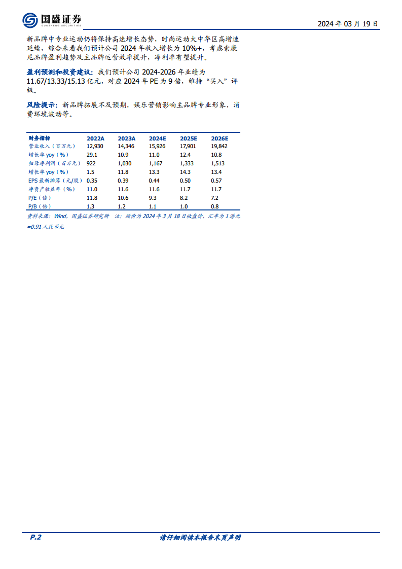 公司预计2024年1月以来,特步主品牌终端流水增速稳健,折扣稳定。新品牌中专业运动将保持高速增长态势,时尚运动大中华区高增速延续。综合来看,预计公司2024年收入增长将超过10%,且随着索康尼品牌盈利趋势的巩固和主品牌运营效率的提升,净利率有望进一步提升。 国盛证券研究所预计特步国际2024-2026年归母净利润分别为11.67亿元、13.33亿元和15.13亿元,对应2024年PE为9倍,维持“买入”评级。
