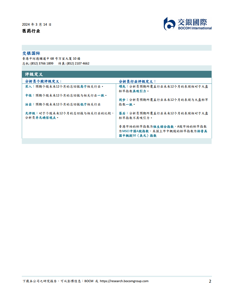 本报告由交银国际研究发布,旨在为医药行业投资者提供一份详尽的2024年3月14日更新的主要医药公司业绩发布日程表。该日程表涵盖了从2024年3月11日至4月14日期间,包括A股、港股及部分美股上市的73家医药及相关公司的业绩发布时间。通过对这些关键时间节点的梳理,投资者可以高效规划其市场关注点,及时获取公司最新运营及财务表现。此外,报告还包含了交银国际的评级定义、分析师披露、商业关系及财务权益披露以及全面的免责声明,确保研究报告的透明度和合规性。