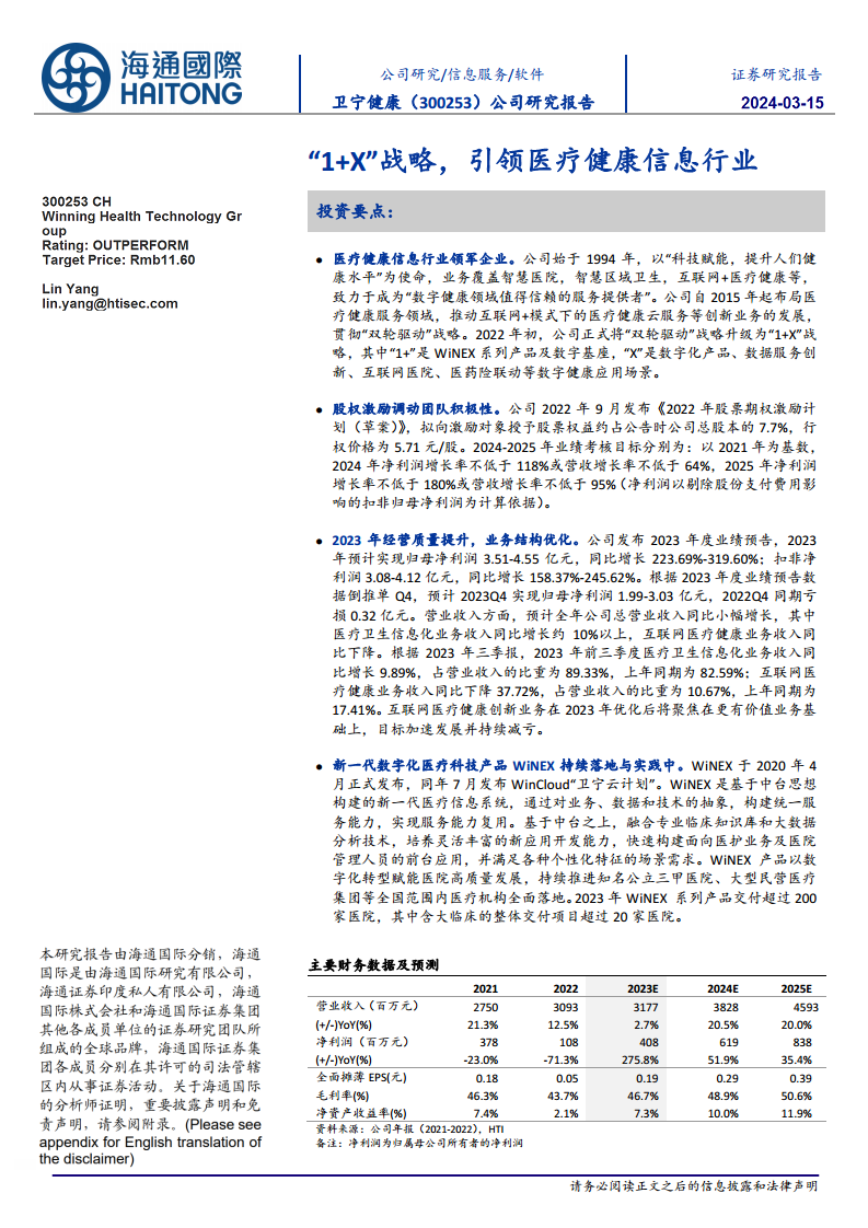 卫宁健康作为中国医疗健康信息行业的领军企业,通过其“1+X”战略和核心产品WiNEX的广泛落地,展现出强劲的增长潜力和市场竞争力。公司在2023年实现了显著的经营业绩改善,归母净利润和扣非净利润均大幅增长,业务结构持续优化。股权激励计划有效激发了团队积极性,而WiNGPT和WiNEX Copilot等医疗AI产品的推出,则进一步巩固了公司在技术创新领域的领先地位。