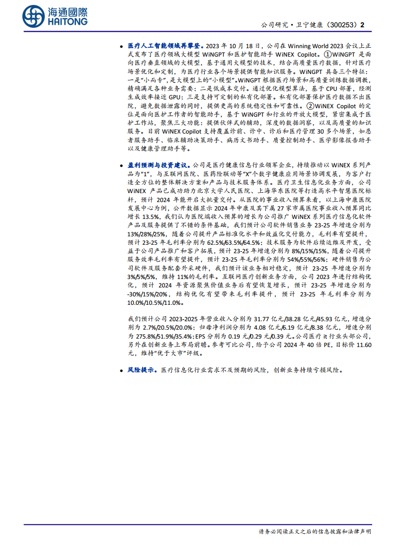 鉴于卫宁健康作为医疗IT行业的头部公司及其在创新业务上的前瞻布局,参考可比公司(平均2024年PE为26倍,卫宁健康为25倍),报告给予公司2024年40倍PE,目标价11.60元,维持“优于大市”评级。