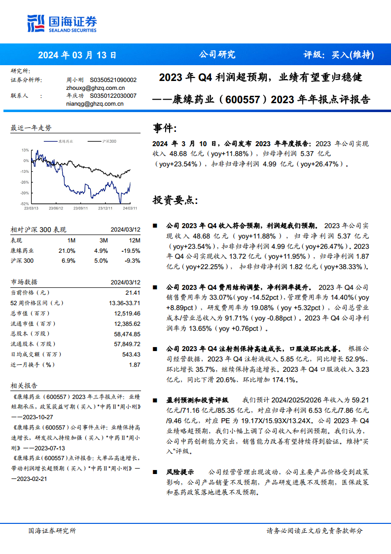康缘药业(600557):2023年年报点评报告:2023年Q4利润超预期,业绩有望重归稳健