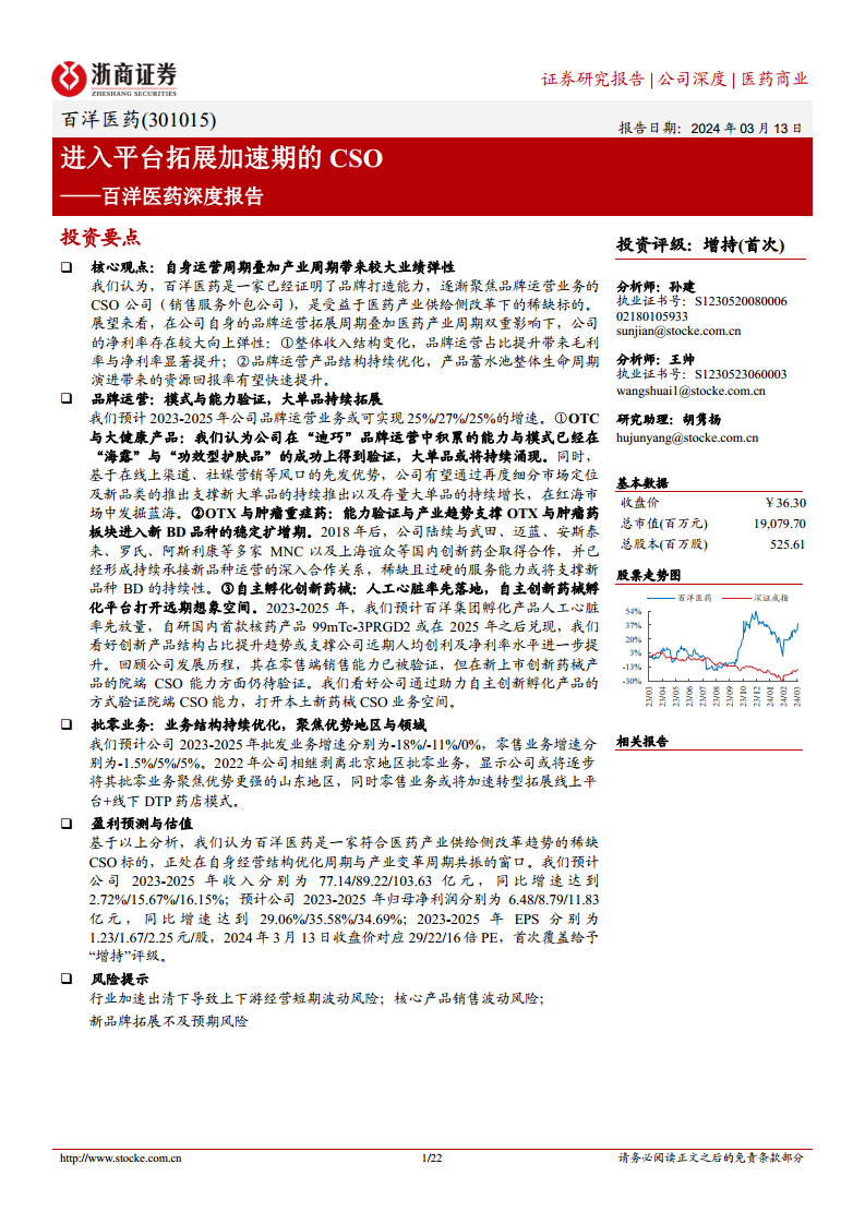 报告首次覆盖百洋医药,给予“增持”评级。截至2024年3月13日收盘价,公司2023-2025年PE分别为29/22/16倍。