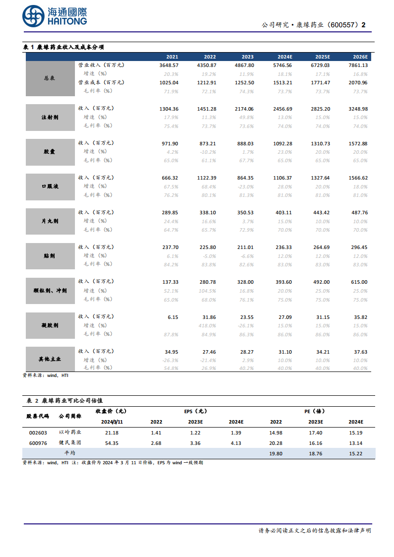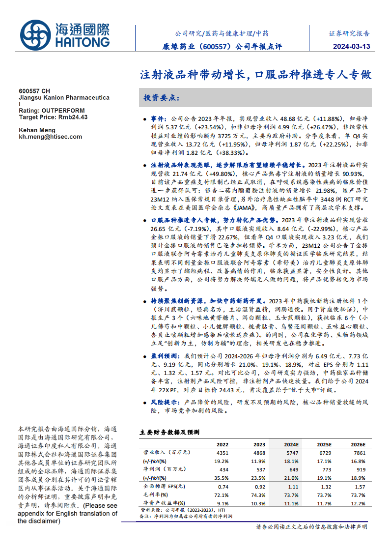基于公司2023年的业绩表现和未来的发展策略,分析师对康缘药业的盈利能力持乐观态度。预计公司2024-2026年归母净利润将分别达到6.49亿元、7.73亿元和9.19亿元,同比增速分别为21.0%、19.1%和18.9%。对应的每股收益(EPS)预计分别为1.11元、1.32元和1.57元。与可比公司(如以岭药业、健民集团)相比,康缘药业在研发实力、中药独家品种储备、注射剂产品风险可控以及非注射剂产品快速放量方面具有显著优势。鉴于此,分析师给予公司2024年22倍PE的估值,对应目标价24.43元,并首次覆盖给予“优于大市”评级。