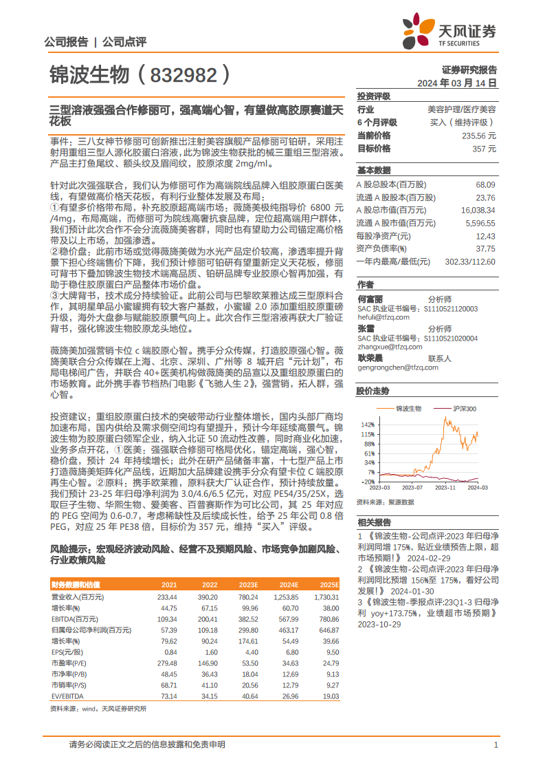 报告强调,锦波生物正通过多点开花的业务布局加速商业化进程。在医美领域,除了与修丽可的合作优化市场格局外,公司还通过薇旖美品牌加强C端营销,携手分众传媒和热门电影进行市场教育和心智卡位,并储备丰富的在研产品(如十七型胶原)以构建矩阵化产品线。在原料业务方面,与巴黎欧莱雅的合作持续放量,再次验证了其三型原料的技术实力。这些举措共同驱动公司业绩持续高增长,预计2023-2025年归母净利润将分别达到3.0亿元、4.6亿元和6.5亿元,对应PE分别为54X、35X和25X。基于其稀缺性和成长性,报告维持“买入”评级,并给出357元的目标价。