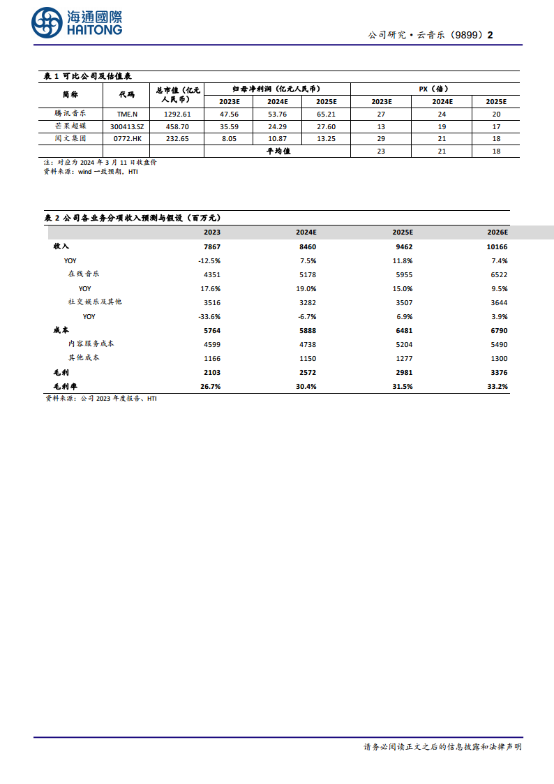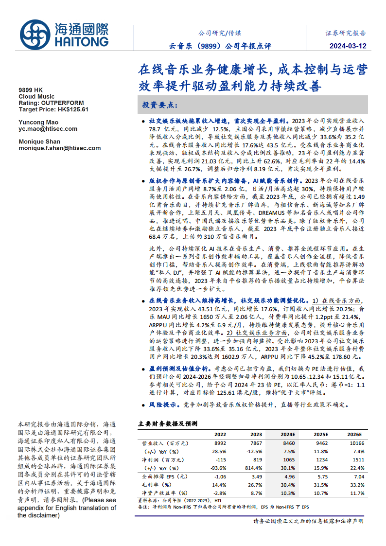 云音乐在2023年通过在线音乐业务的健康增长、有效的成本控制和运营效率提升,首次实现了全年盈利,调整后归母净利润达8.19亿元。尽管社交娱乐服务收入因策略调整而下降,但在线音乐业务的强劲表现(收入增长17.6%,MAU达2.06亿,付费率21.4%)有效支撑了公司业绩。公司持续扩充1.49亿首音乐曲目内容储备,并积极扶持68.4万独立音乐人。同时,AI技术在音乐生产、消费和推荐全流程的深度应用,显著提升了用户体验和平台效率。分析师预计公司未来盈利将持续增长,2024-2026年经调整归母净利润分别达10.65亿、12.34亿和15.11亿元,并维持“优于大市”评级,目标价125.61港元/股,但需关注市场竞争和政策不确定性风险。
