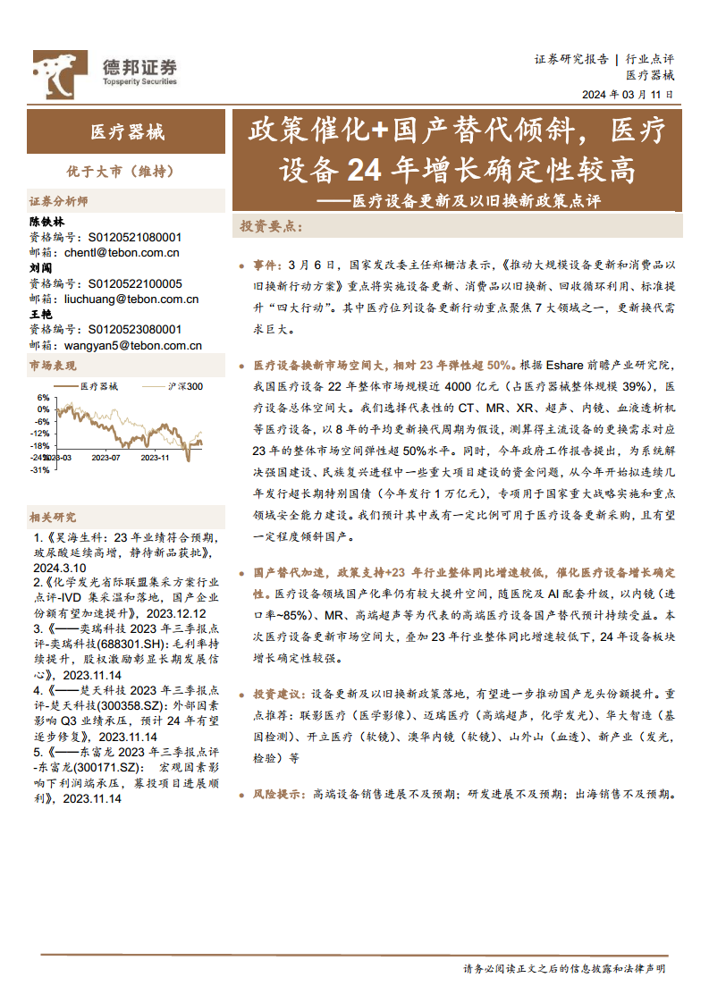 本报告分析指出,在国家大规模设备更新和消费品以旧换新政策的强力推动下,医疗设备行业正迎来重要的发展机遇。政策将显著扩大医疗设备市场空间,并通过超长期特别国债提供资金支持,同时明确倾向于国产设备采购。这不仅加速了高端医疗设备的国产替代进程,也为2024年医疗设备板块带来了较高的增长确定性。建议关注在医学影像、高端超声、基因检测、内镜、血透等领域具有竞争优势的国产龙头企业,但需警惕高端设备销售、研发进展及出海销售不及预期的风险。
