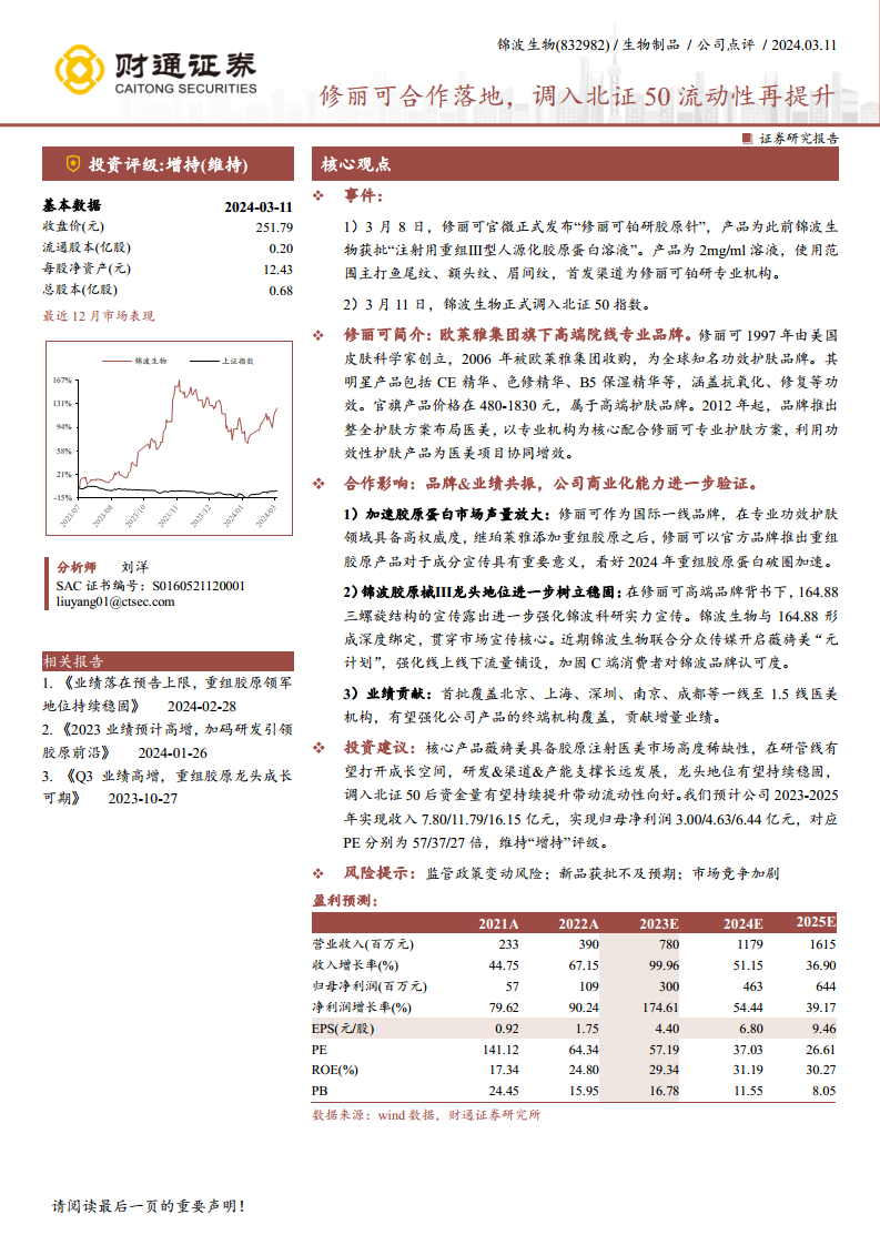 公司核心产品薇旖美具备高度稀缺性,配合修丽可的渠道拓展,有望带来显著的业绩增长。同时,锦波生物被调入北证50指数,预计将有效提升股票流动性,为公司长期发展提供资金支持。