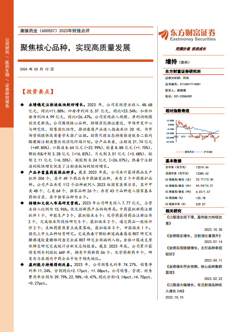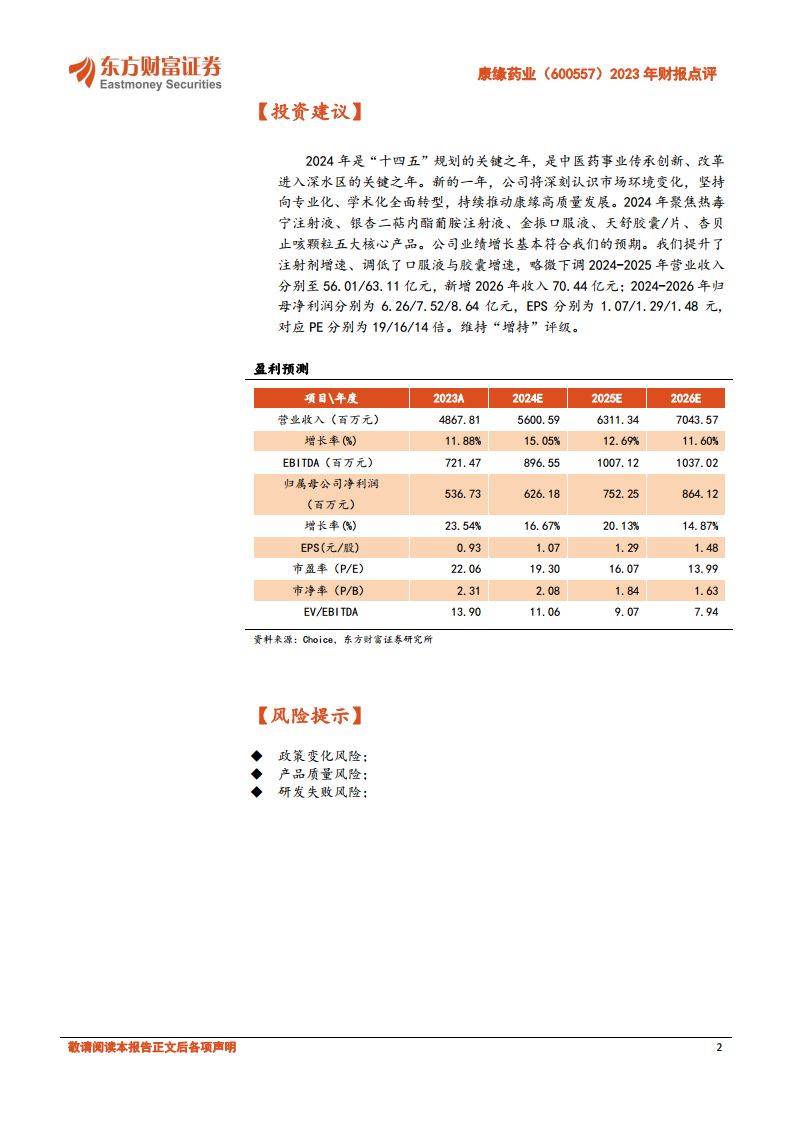 盈利能力方面,2023年公司销售毛利率为74.27%,同比提升2.17个百分点;销售净利率为11.24%,同比提升1.08个百分点。销售费用率同比下降3.14个百分点至39.79%,管理费用率同比上升4.70个百分点至22.98%,财务费用率为-0.47%。东方财富证券维持“增持”评级,并调整了盈利预测,预计2024-2026年归母净利润分别为6.26/7.52/8.64亿元,对应PE分别为19/16/14倍。主要风险提示包括政策变化、产品质量和研发失败。