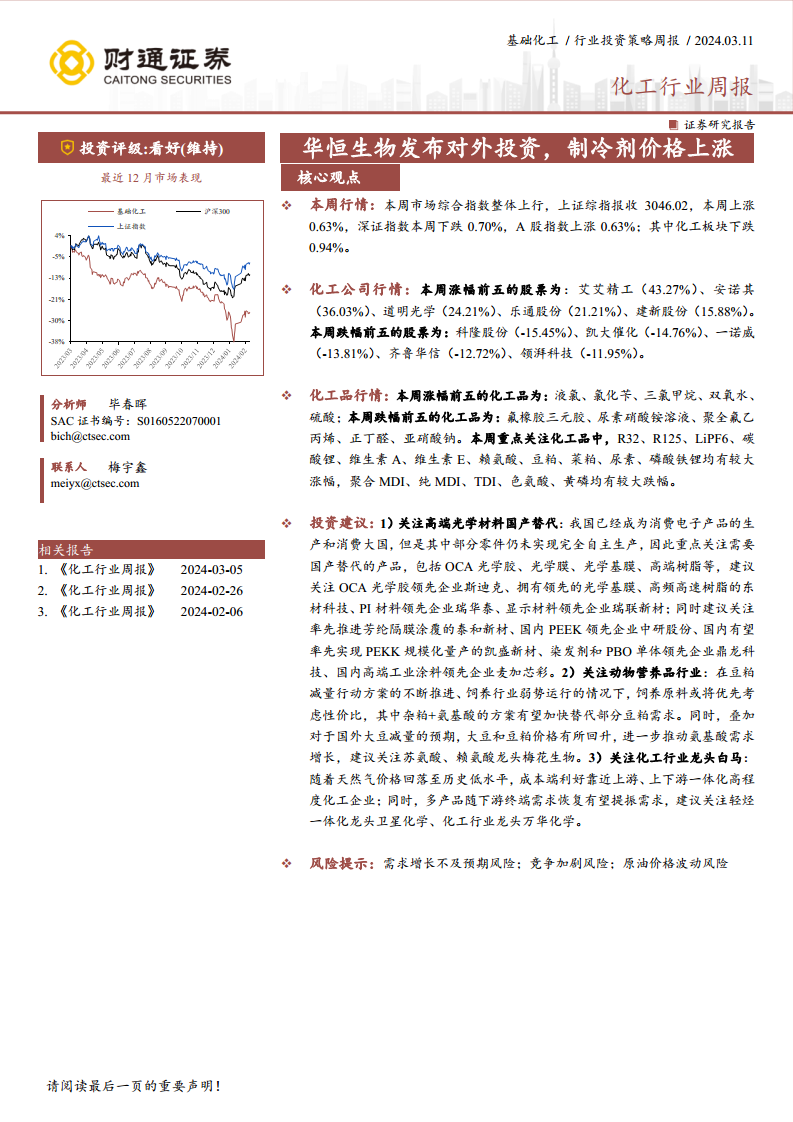 化工行业周报:华恒生物发布对外投资,制冷剂价格上涨