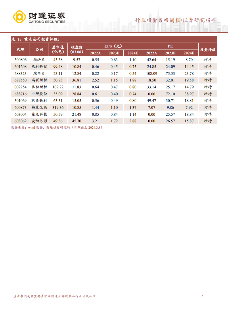 我国作为消费电子产品的生产和消费大国,部分关键零件仍依赖进口。因此,报告建议重点关注需要国产替代的产品,包括OCA光学胶、光学膜、光学基膜、高端树脂等。具体推荐企业有:OCA光学胶领先企业斯迪克;拥有领先光学基膜、高频高速树脂的东材科技;PI材料领先企业瑞华泰;显示材料领先企业瑞联新材。同时,还建议关注率先推进芳纶隔膜涂覆的泰和新材、国内PEEK领先企业中研股份、有望率先实现PEKK规模化量产的凯盛新材、染发剂和PBO单体领先企业鼎龙科技以及国内高端工业涂料领先企业麦加芯彩。