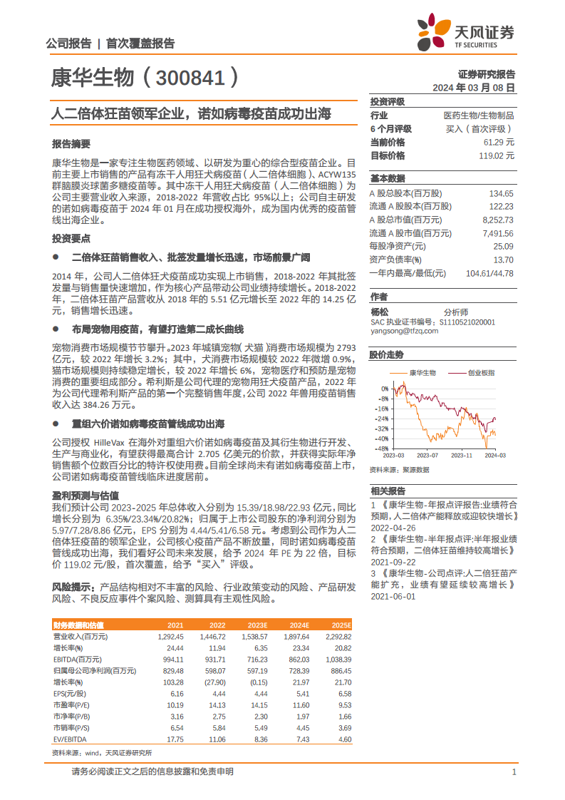 基于公司在人二倍体狂苗市场的领导地位、核心疫苗产品的持续放量以及诺如病毒疫苗管线成功出海的积极进展,本报告首次覆盖并给予康华生物“买入”评级,目标价119.02元/股,预期公司未来发展前景广阔。