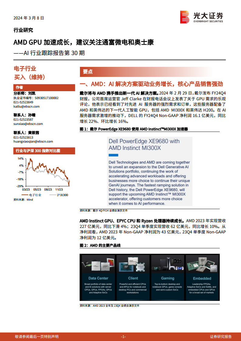 AMD凭借其MI300X GPU、EPYC CPU和Ryzen处理器等AI解决方案,在数据中心和消费者业务领域实现显著增长,并获得戴尔、微软等行业巨头的广泛部署,预示2024年强劲增长势头。