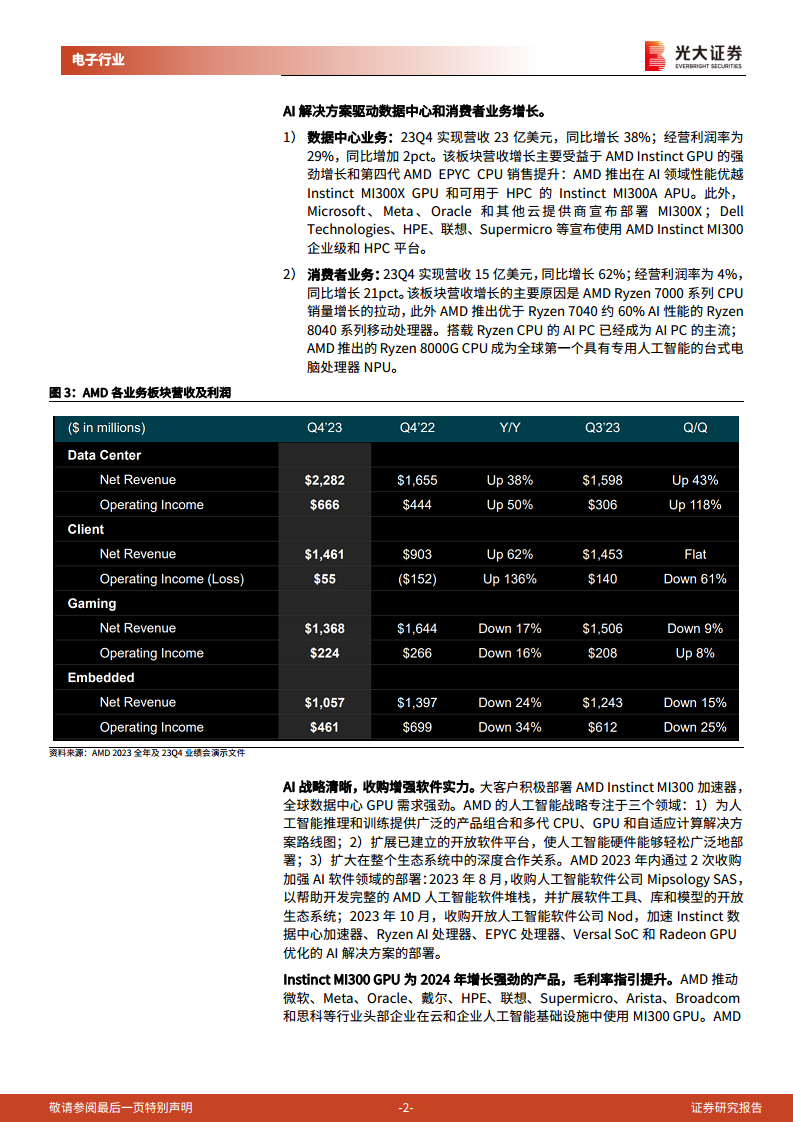 消费者业务: 23Q4营收15亿美元,同比增长62%,经营利润率大幅增长21个百分点至4%。主要驱动力是AMD Ryzen 7000系列CPU销量的增长,同时AMD还推出了AI性能优于Ryzen 7040约60%的Ryzen 8040系列移动处理器,以及全球首个具有专用人工智能NPU的台式电脑处理器Ryzen 8000G CPU,使搭载Ryzen CPU的AI PC成为市场主流。