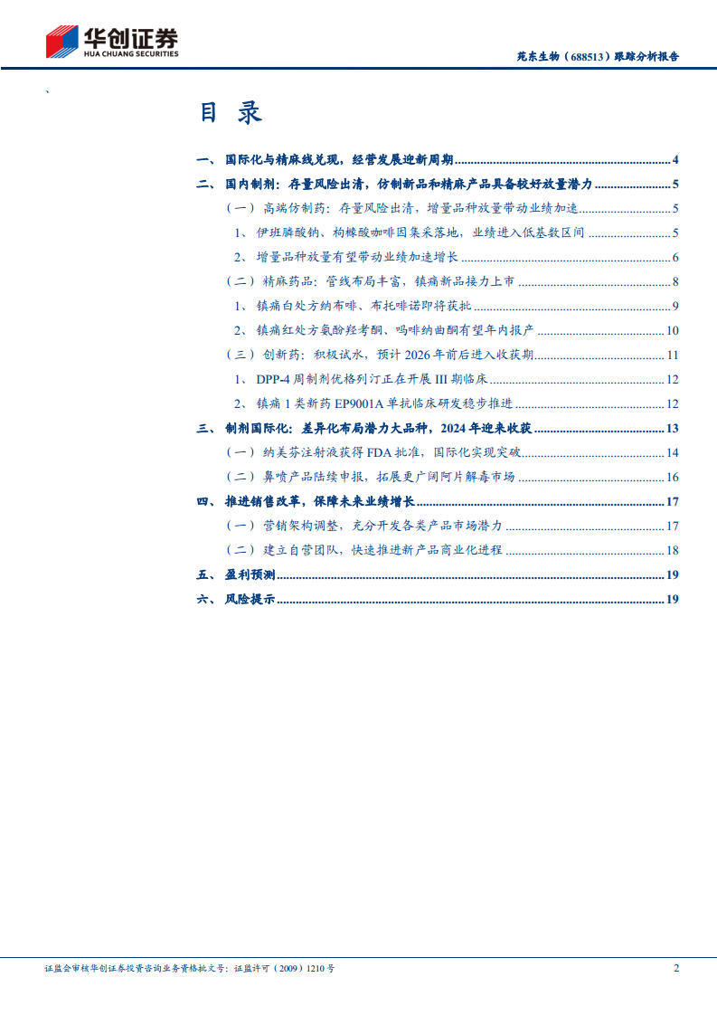 报告核心观点指出,苑东生物的增长逻辑清晰且具备长期潜力。短期内,国内高端仿制药新品的持续获批上市将带动业绩快速恢复增长。中期来看,公司在精麻药品领域的丰富管线布局以及制剂国际化业务的实质性突破,将显著拓宽公司的成长天花板,并有望进一步加速业绩增长。长期而言,公司丰富的创新药产品管线预计将于2026年起逐步进入收获期,形成新的业绩增量,确保公司持续发展。