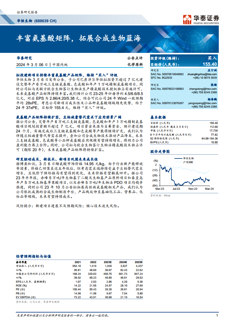 华恒生物通过积极投资新项目和获取技术授权,持续扩充其氨基酸产品矩阵,特别是在三支链氨基酸、色氨酸和精氨酸等小品种领域。在豆粕减量替代需求和合成生物技术降本的驱动下,公司未来盈利能力有望显著提升。华泰研究维持“买入”评级,并基于公司强劲的成长性和行业领先优势,给予2024年37xPE,目标价155.4元。公司现有项目稳步推进,研发驱动产品线持续拓展,但需关注新建项目进展和核心技术流失风险。