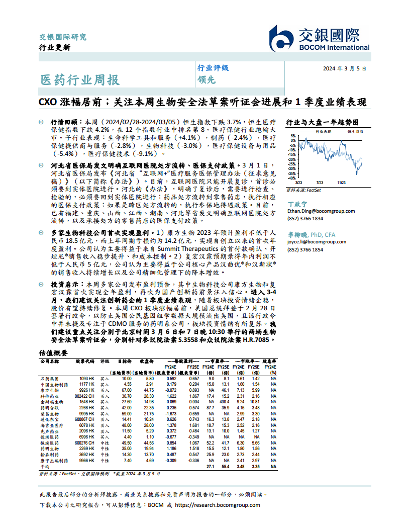 CXO涨幅居前,关注本周生物安全法草案听证会进展和1季度业绩表现