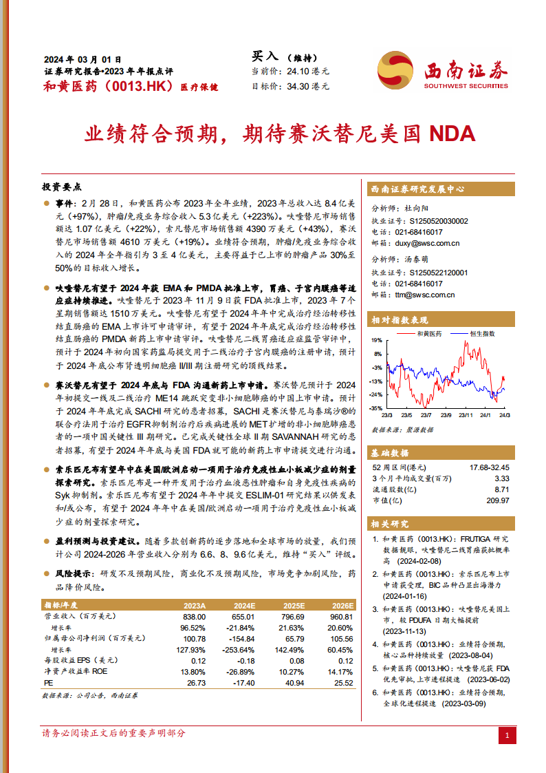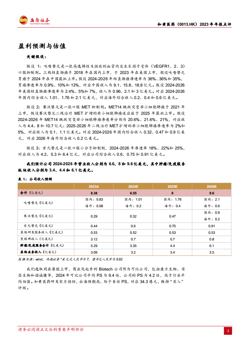 尽管分析师预测和黄医药在2024年可能面临短期盈利压力,归属母公司净利润预计将出现亏损,但随着多款创新药在全球市场的逐步放量和新适应症的获批,公司预计在2025-2026年恢复并实现强劲的盈利增长。西南证券维持对和黄医药的“买入”评级,并基于公司强大的研发实力和高出海预期,认为其当前估值(2024年PS为4.2倍,低于可比公司平均9.4倍)具备吸引力,存在长期投资价值。同时,报告也提示了研发不及预期、商业化不及预期、市场竞争加剧和药品降价等潜在风险,但公司多元化的产品管线和全球市场策略有望有效对冲部分风险。