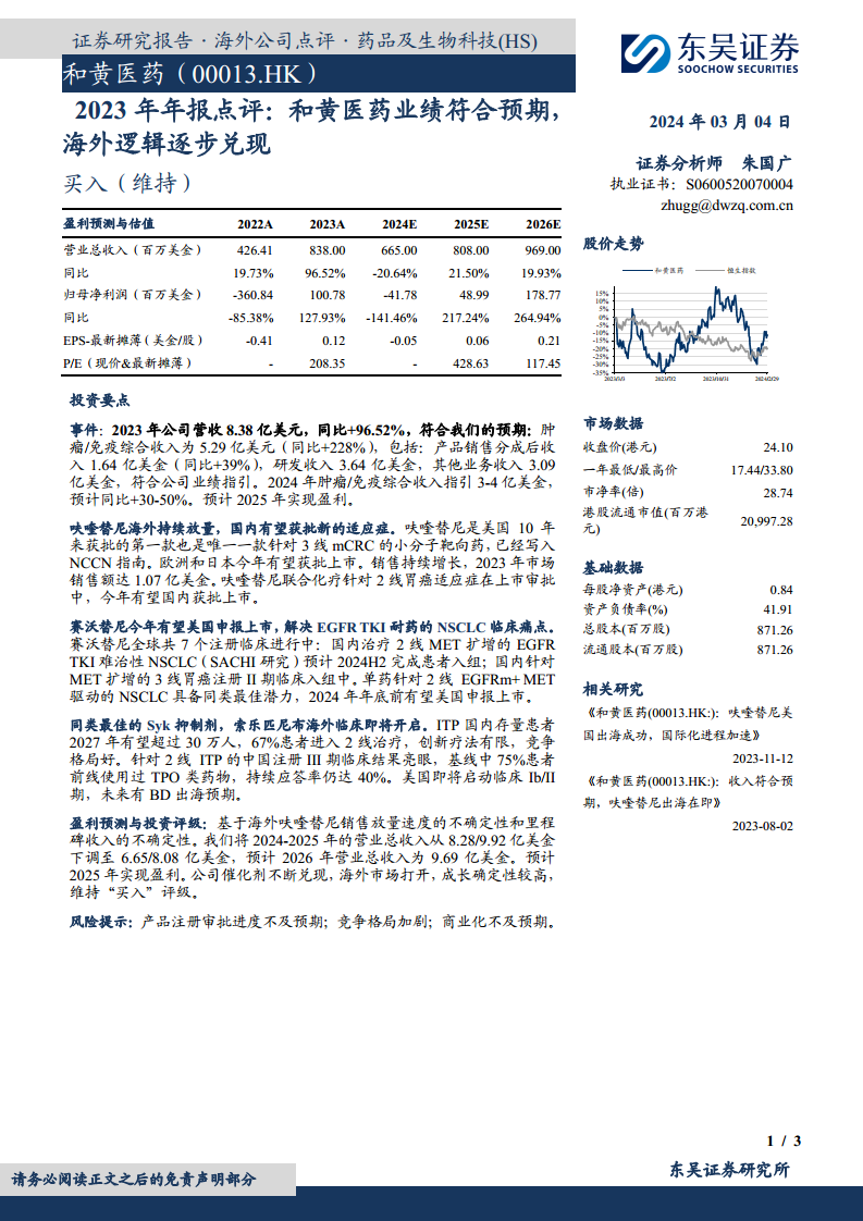 和黄医药2023年业绩表现超出预期,总营收同比增长96.52%至8.38亿美元,归母净利润实现扭亏为盈。这一增长主要得益于肿瘤/免疫综合收入的显著提升和核心产品呋喹替尼在海外市场的成功拓展,其已进入美国NCCN指南并持续放量。公司在创新药物研发方面持续取得进展,赛沃替尼有望在美国申报上市,索乐匹尼布也展现出同类最佳潜力并即将启动海外临床。尽管短期营收预测有所调整,但随着海外市场的进一步打开和新适应症的获批,公司有望在2025年实现盈利,并保持较高的成长确定性。基于此,维持“买入”评级,但投资者仍需关注产品审批、市场竞争及商业化等潜在风险。