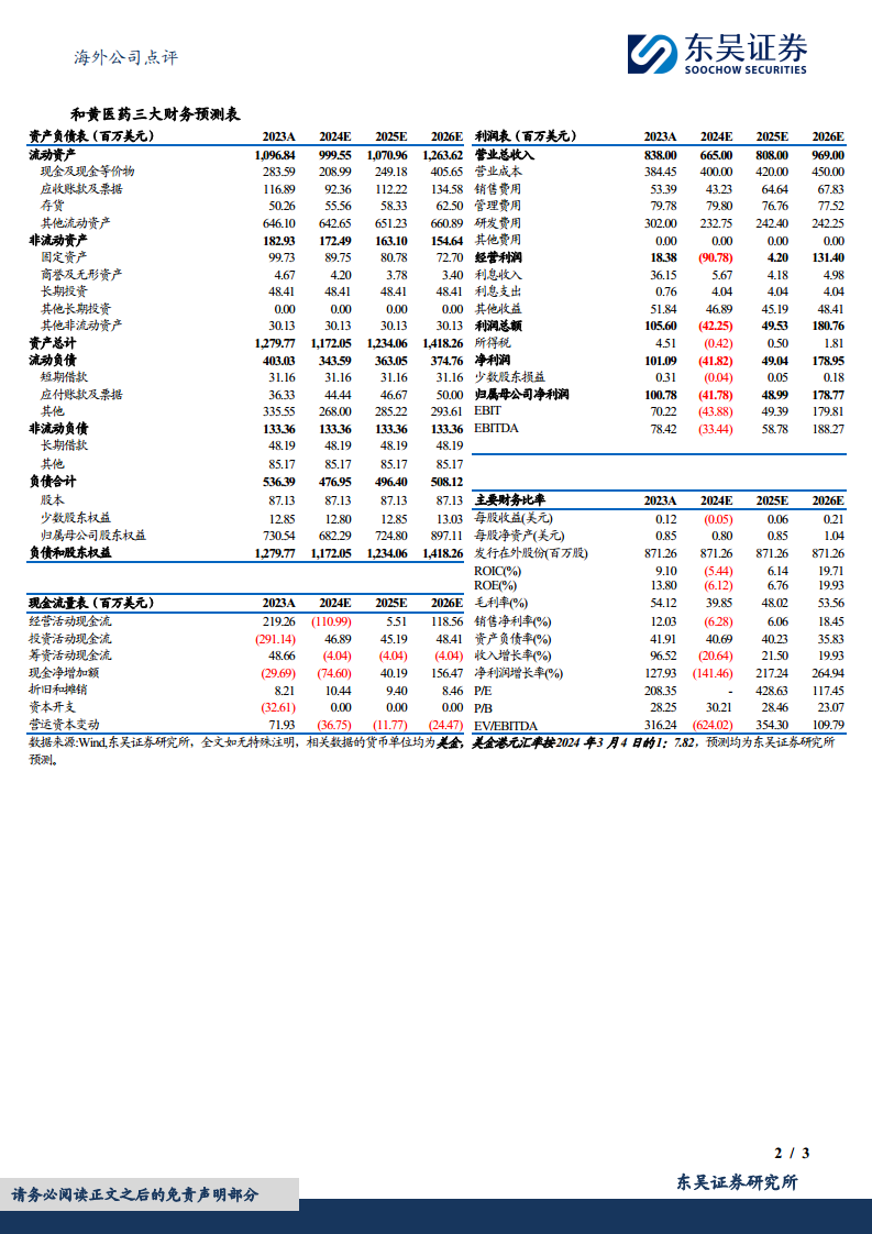 基于呋喹替尼海外销售放量速度的不确定性和里程碑收入的不确定性,东吴证券将和黄医药2024-2025年的营业总收入预测分别下调至6.65亿美元和8.08亿美元(原预测为8.28亿美元和9.92亿美元),但预计2026年营业总收入将达到9.69亿美元。公司预计将在2025年实现盈利。鉴于公司催化剂不断兑现、海外市场逐步打开以及较高的成长确定性,东吴证券维持“买入”评级。同时,报告提示风险包括产品注册审批进度不及预期、竞争格局加剧以及商业化不及预期。