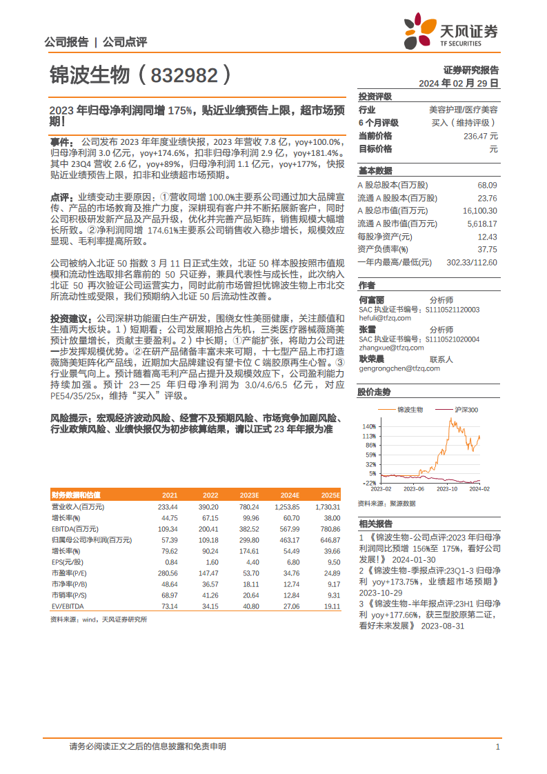 锦波生物在2023年取得了令人瞩目的业绩增长,营收和归母净利润同比增幅均超100%,显著超出市场预期。这得益于公司在市场推广、产品创新和规模效应方面的有效策略。公司被纳入北证50指数,进一步提升了其市场认可度和流动性。展望未来,锦波生物凭借其在功能蛋白领域的深厚积累,以及在“薇旖美”产品放量、产能扩张、产品线丰富和品牌建设上的清晰战略,有望在颜值和生殖两大健康美丽板块持续保持强劲增长势头。尽管存在宏观经济波动、市场竞争加剧等风险,但公司整体发展前景积极,维持“买入”评级。