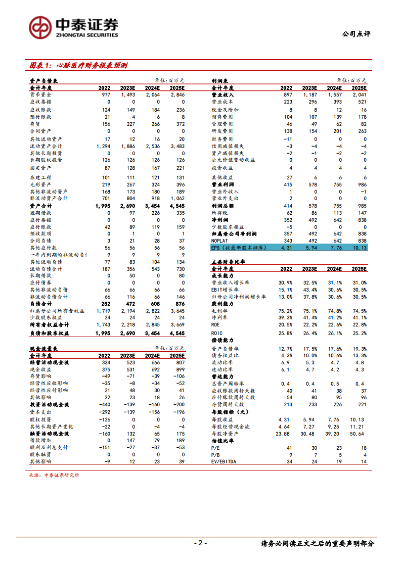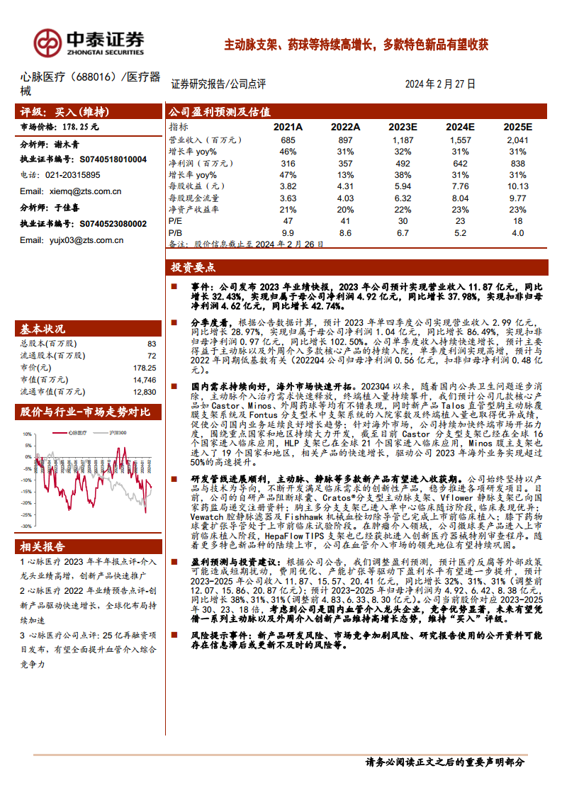 心脉医疗在2023年实现了强劲的业绩增长,营业收入和净利润均保持高速增长,尤其在第四季度表现突出。这主要得益于国内主动脉介入需求的快速释放、核心产品的持续市场渗透以及新产品的优异表现。公司积极拓展海外市场,海外业务实现超过50%的高速增长。同时,心脉医疗拥有丰富的研发管线,多款创新产品已进入注册或临床后期阶段,有望在未来陆续上市,进一步巩固其在血管介入市场的领先地位。尽管存在新产品研发和市场竞争加剧等风险,但鉴于其作为国内血管介入龙头的竞争优势和创新产品驱动的高增长潜力,公司被维持“买入”评级。