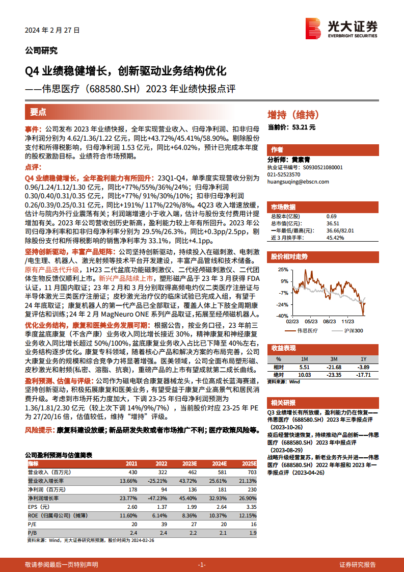伟思医疗在2023年实现了强劲的业绩增长,营业收入和归母净利润同比分别增长43.72%和45.41%,盈利能力显著回升。公司通过持续的创新投入,成功推出了多款迭代升级和新兴产品,尤其在医美和多元康复领域取得了重要进展。业务结构得到优化,精神康复和神经康复业务实现高速增长,盆底康复业务占比下降,显示出公司业务多元化和转型升级的成效。医美业务的全面布局有望成为公司新的增长引擎。尽管面临市场波动和费用增加,公司凭借其在康复器械领域的龙头地位和创新能力,预计将持续受益于康复产业的高景气度和消费升级趋势。光大证券维持其“增持”评级,并提醒投资者关注康复科建设放缓、新品推广及医疗政策等潜在风险。