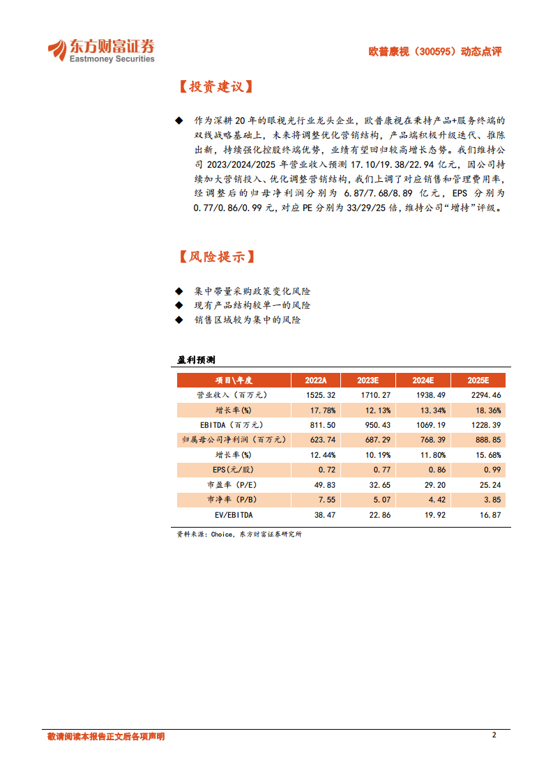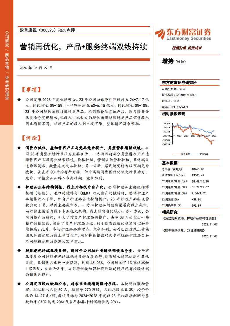 欧普康视在2023年实现了净利润的稳健增长,但面临角膜塑形镜业务增速放缓和护理品业务结构调整的市场挑战。公司积极应对,通过将护理品销售渠道向线上集中、加大自产护理品推广以及持续强化控股视光终端建设,以优化营销结构并提升市场竞争力。股权激励计划的发布,设定了未来五年20%以上的业绩增长目标,充分体现了公司对长期发展的乐观预期和信心。尽管存在集中带量采购政策变化、产品结构单一和销售区域集中等潜在风险,但作为眼视光行业的龙头企业,欧普康视有望通过持续的战略优化和市场深耕,实现业绩的稳健增长,因此维持“增持”评级。